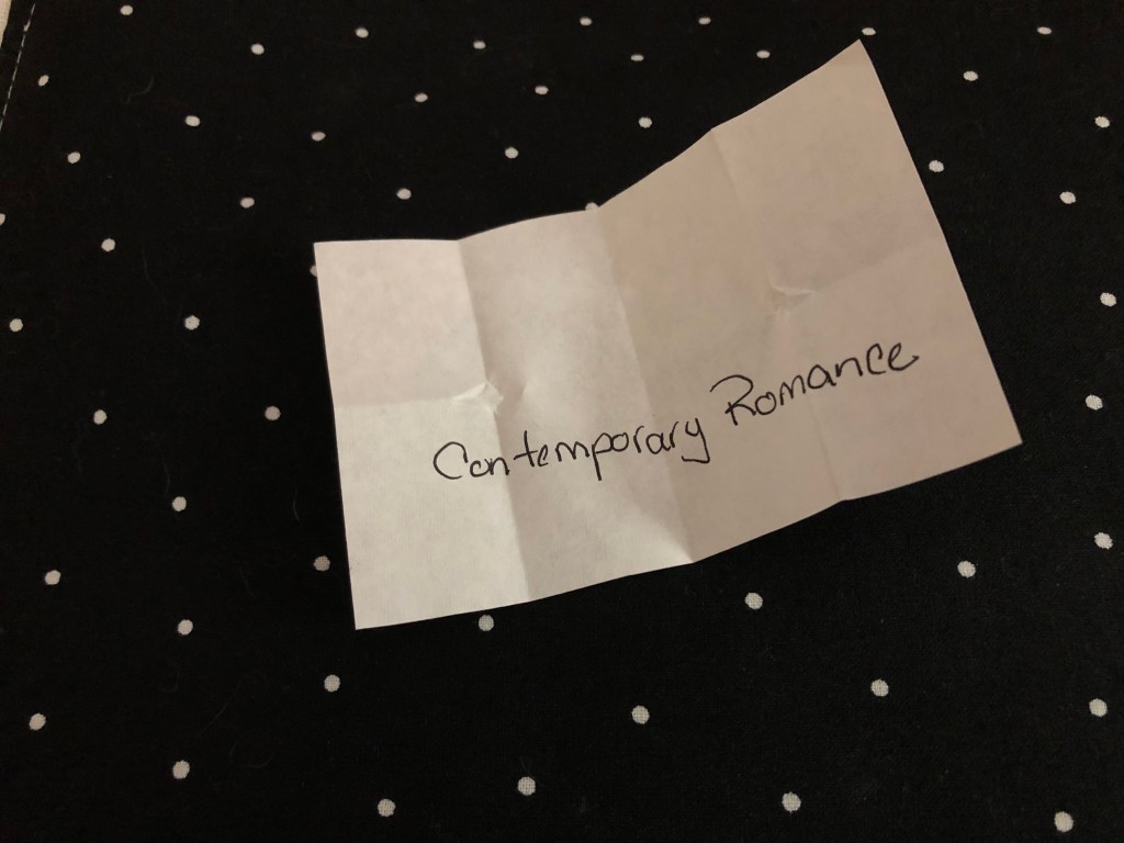 The genre I picked from the dish is Contemporary Romance. Oh dear. I had a feeling this would happen because this is my least favorite type of book. But I’m committed.
